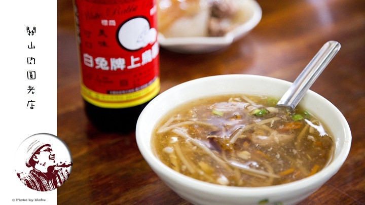 關山肉圓老店的醋也很特別,不用大牌子,轉找特別自釀的牌子,白兔牌他是老字號,量不多,全都是自己釀的,加一點到肉羹湯裡面,酸度是有出來,是一種很濃郁的酸,但也不會太酸,還滿搭的。