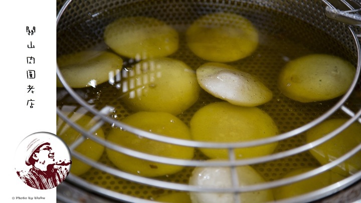 肉圓是用油悶的,要先蒸過才能用低溫油去保溫,油要控制不要給他滾,肉要先醃過,關山肉圓老店遠用的是豬後腿肉,裏頭的筍子用嘉義過來的,肉有加辣椒粉和五香粉去醃,吃起來口味鹹度都夠,扎實肉質與脆度筍子合起來也很配。