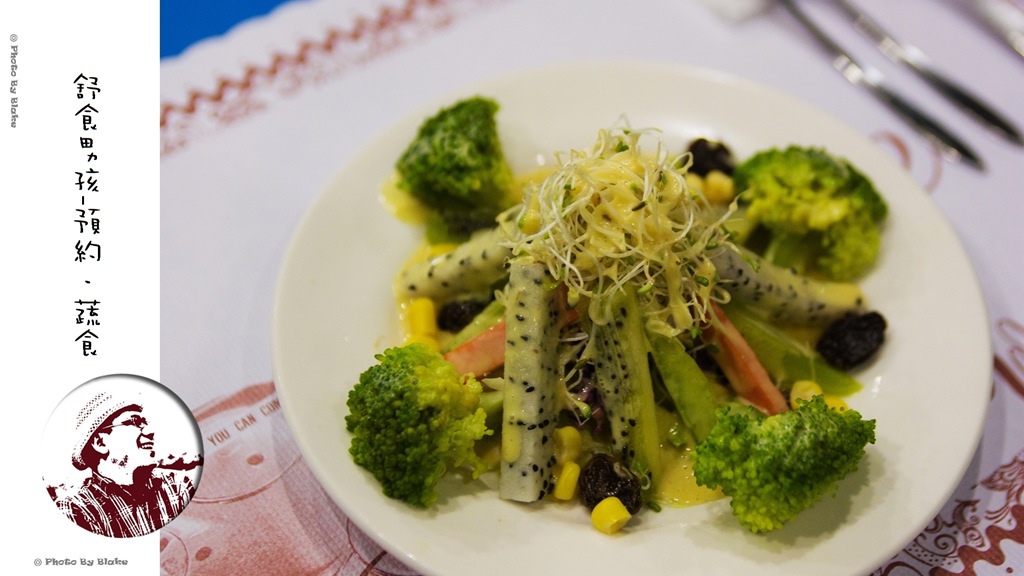 這道蔬果沙拉佐百香果醬,百香果醬本身有一點點水果的酸味,搭上原本有的奇異果跟火龍果,中和其酸甜味道,然後其他的蔬菜部份沒有土味,沾上百香果醬,反而有股小清新感。